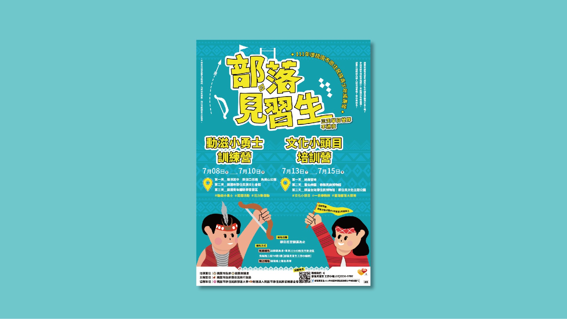 「部落見習生」是以桃園市內國小至國中的原民學生作為招募對象辦理暑期工作營,活動規劃上以深植原民文化、體驗傳統技藝、拓展多元視野等作為目標,希望原民學生透過工作營的體驗及學習認識到自身文化的獨特性與其他族群的文化豐富度。