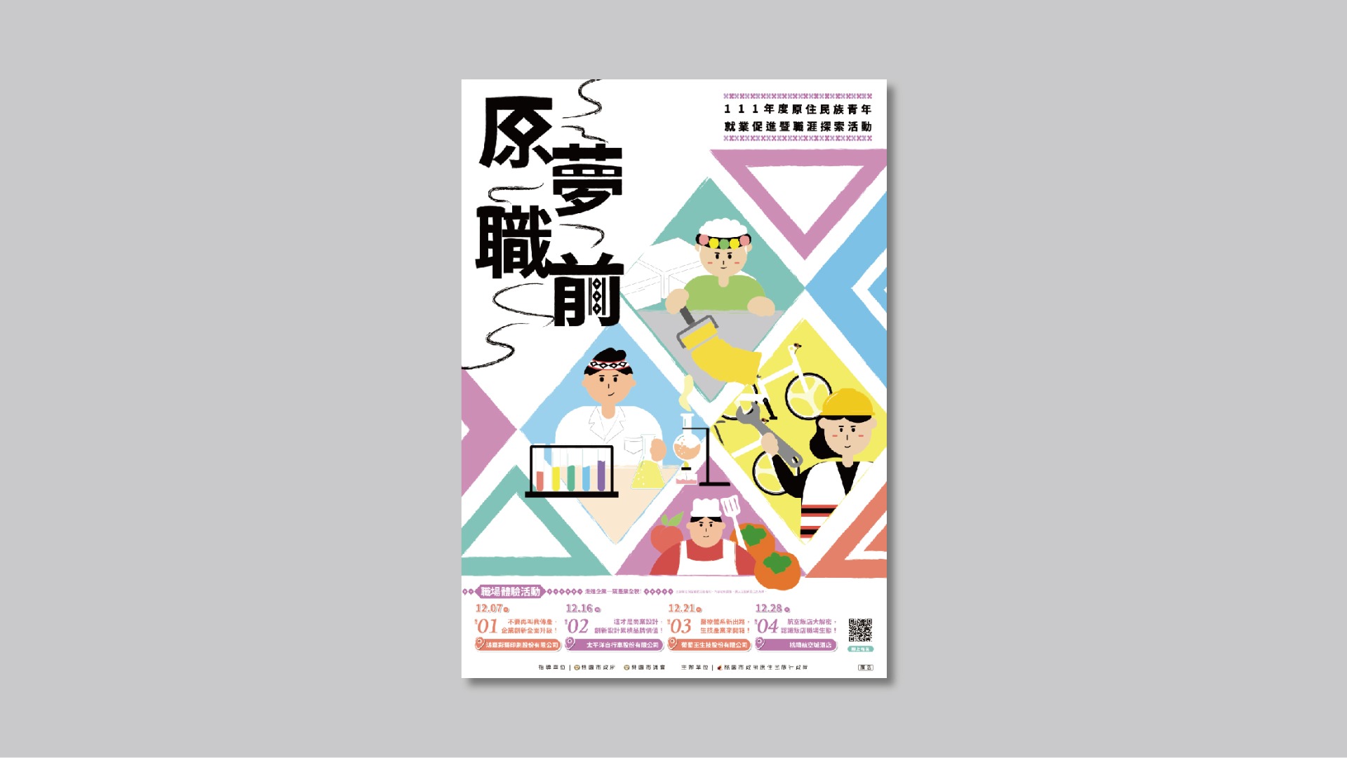 透過就業工作坊、職業探訪等活動,以實際參訪、經驗分享及議題交流,培養桃園市原住民族青年朋友職涯探索及職場軟實力,開創新視野且了解個人特質、職業種類及職場環境現況,獲得職業領域新知,建立就業憧憬,將所學結合資源並付出行動,讓原民青年從中探索職涯及建構職場知識,掌握未來職場契機,創造夢想藍圖,