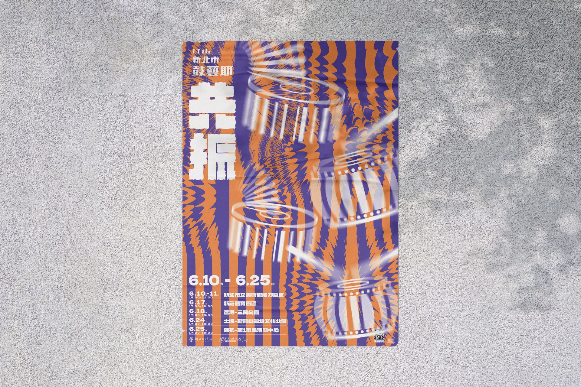 以2023春夏流行色為靈感,本次設計將紫色與橘色編排交錯,打造出極具視覺衝擊力的效果。此外,特別設計出打擊鼓的共振波段效果,藉此傳達音樂所帶來的震撼與熱鬧氛圍,不僅在視覺上引人注目,更讓人能夠直接感受到音樂的力量,展現新北鼓藝節的無限魅力。